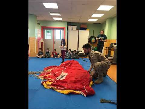 Y LO HIZO DE FORMA MUY DIVERTIDA Y ADECUADA A NOSOTROS: NOS ENSEÑÓ EL SALUDO DE LOS PARACAIDISTAS, UNA PRESENTACIÓN CON LA QUE NOS EXPLICÓ UN MONTÓN DE COSAS SOBRE LOS SALTOS EN PARACAÍDAS, UN VÍDEO CON EL QUE CONSEGUIMOS VOLAR ENTRE LAS NUBES Y ¡UN MONTÓN DE DIVERSIÓN PROTAGONIZADA POR PARACAÍDAS AUTÉNTICOS DE DISTINTOS TAMAÑOS, FORMAS Y COLORES!
